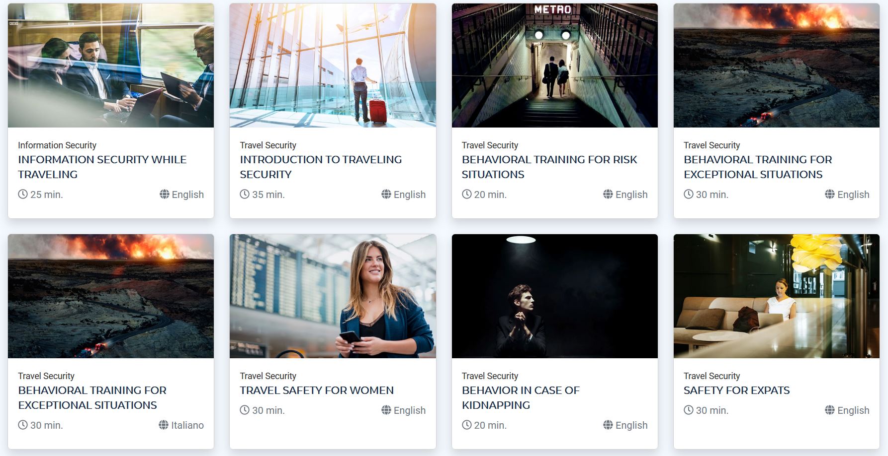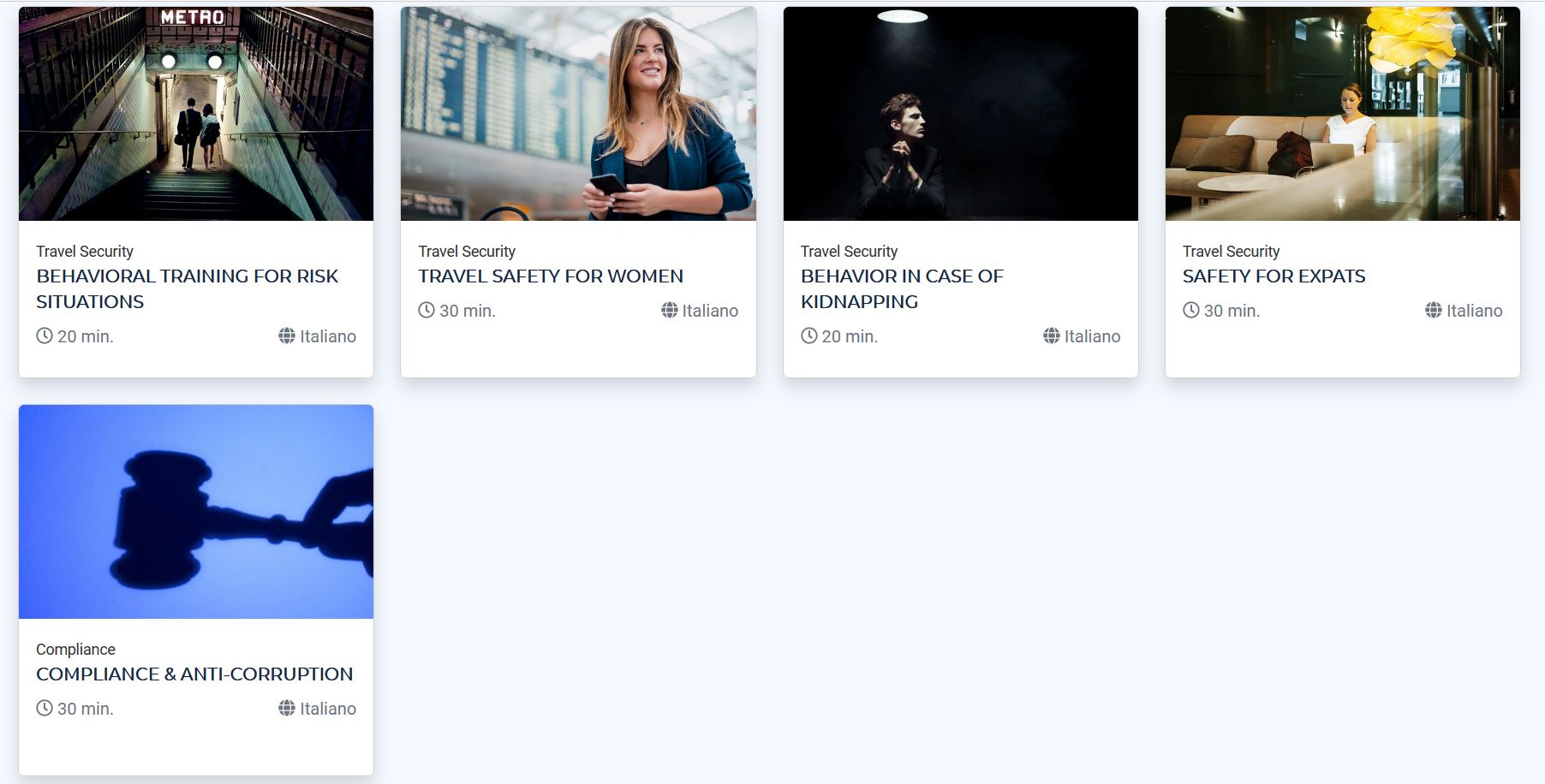 Una vasta scelta di corsi che ti consentirà di coprire esigenze specifiche di Safety & Security, per garantire che i tuoi dipendenti ottengano la consapevolezza necessaria per viaggiare all’estero nel modo più sicuro possibile.